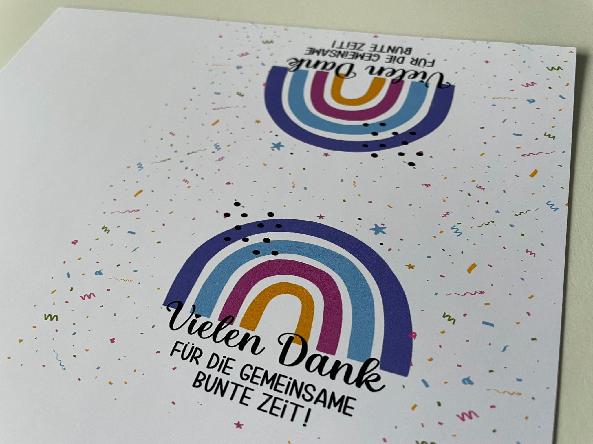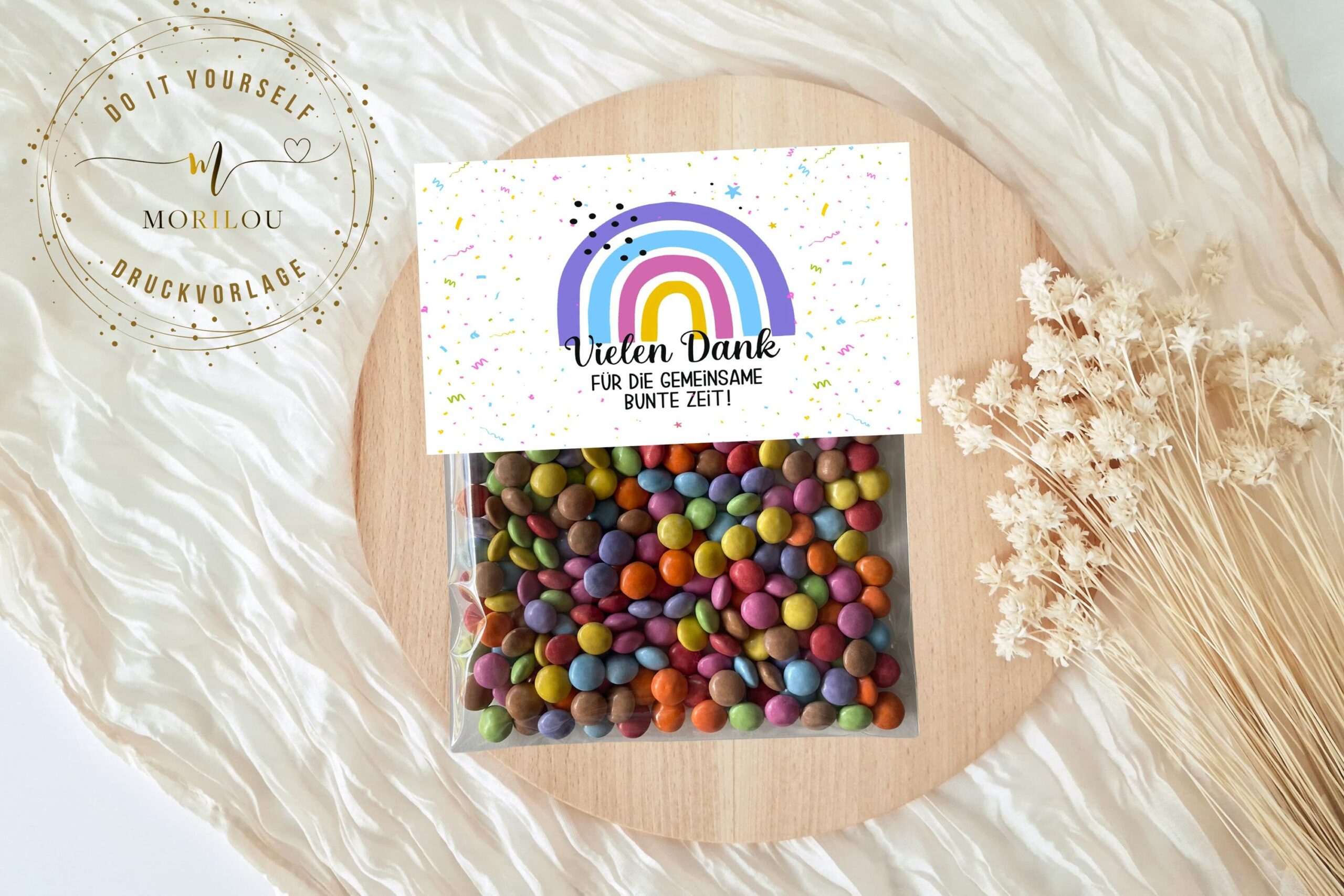 Sag auf liebevolle Weise „Danke“ mit unserem herzlichen Etikett „Danke für die bunte Zeit“. Dieses Design ist perfekt für eine Tüte voller bunter Schokolinsen und eignet sich ideal als Abschiedsgeschenk für Erzieherinnen, den Kindergartenabschluss oder den Ruhestand. Die bunten Farben der Schokolinsen symbolisieren die vielen schönen und unvergesslichen Momente, die in dieser besonderen Zeit erlebt wurden. Mit dieser süßen Aufmerksamkeit drückst du Wertschätzung und Dankbarkeit aus – auf eine ganz persönliche und kreative Weise.Ma ch den Abschied zu einem süßen Highlight und verschenke ein buntes Dankeschön, das von Herzen kommt! ❤️