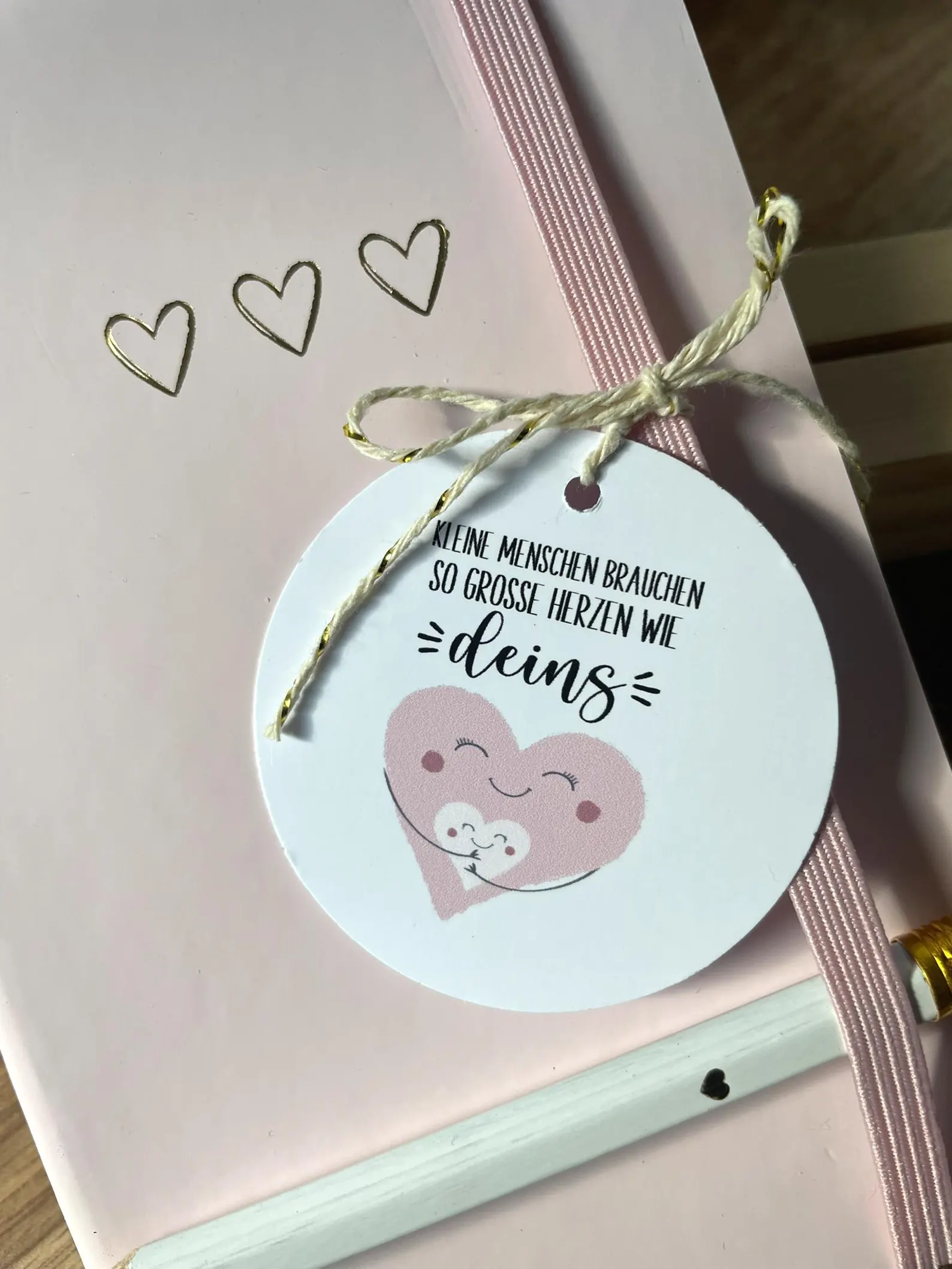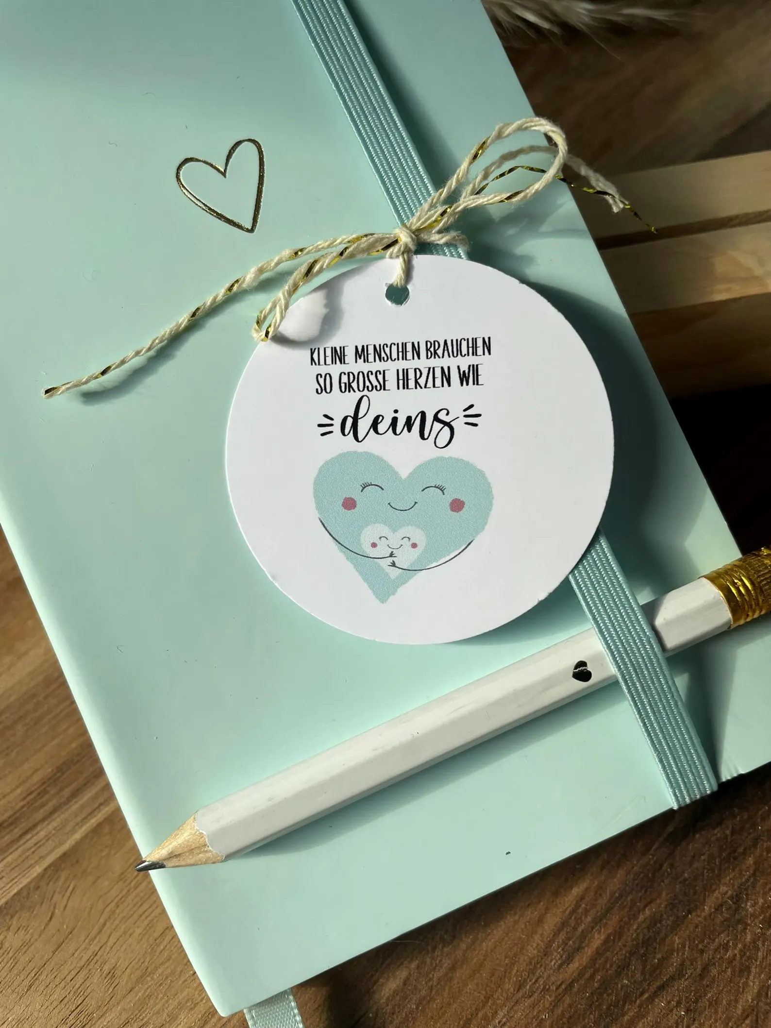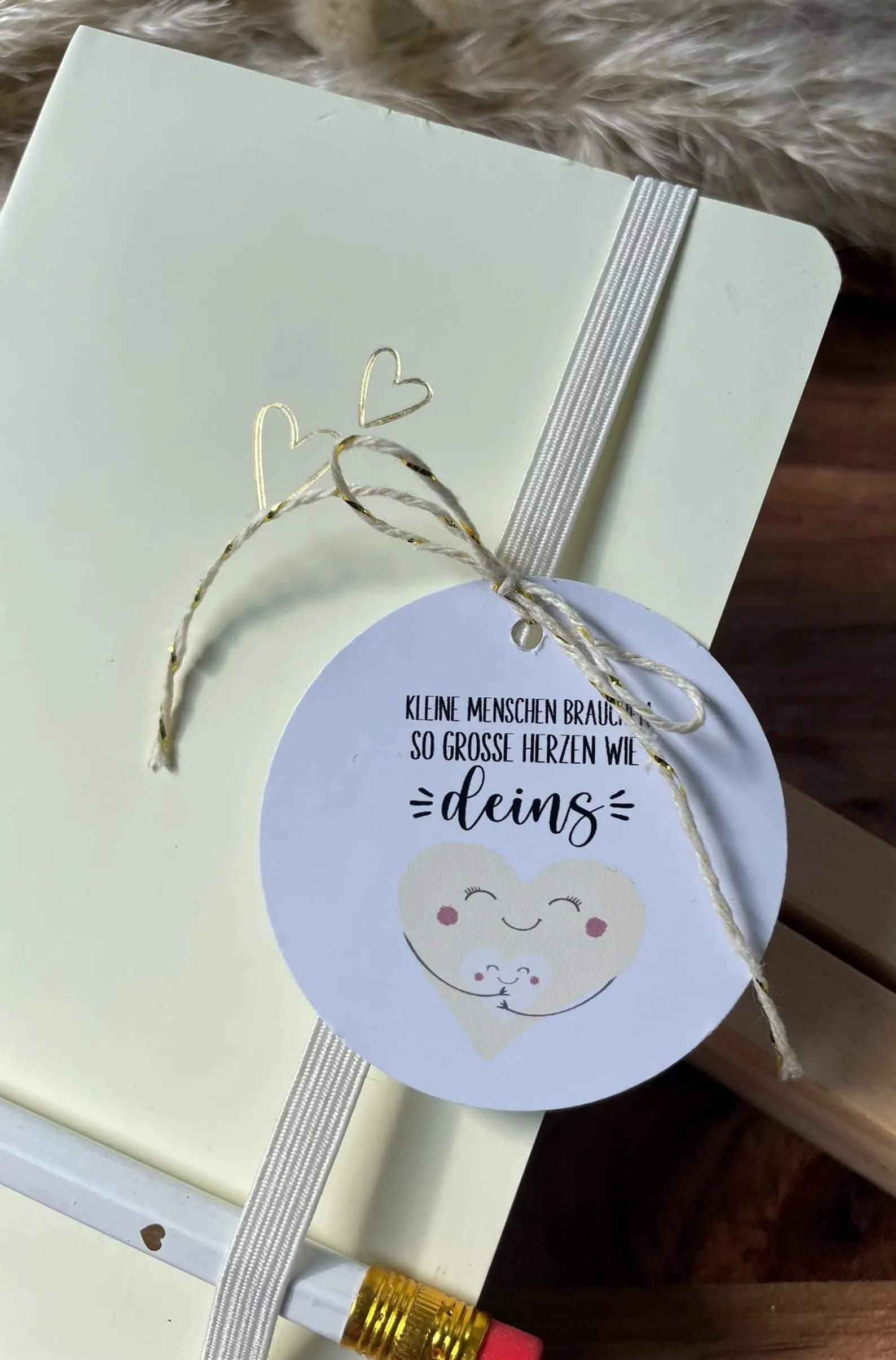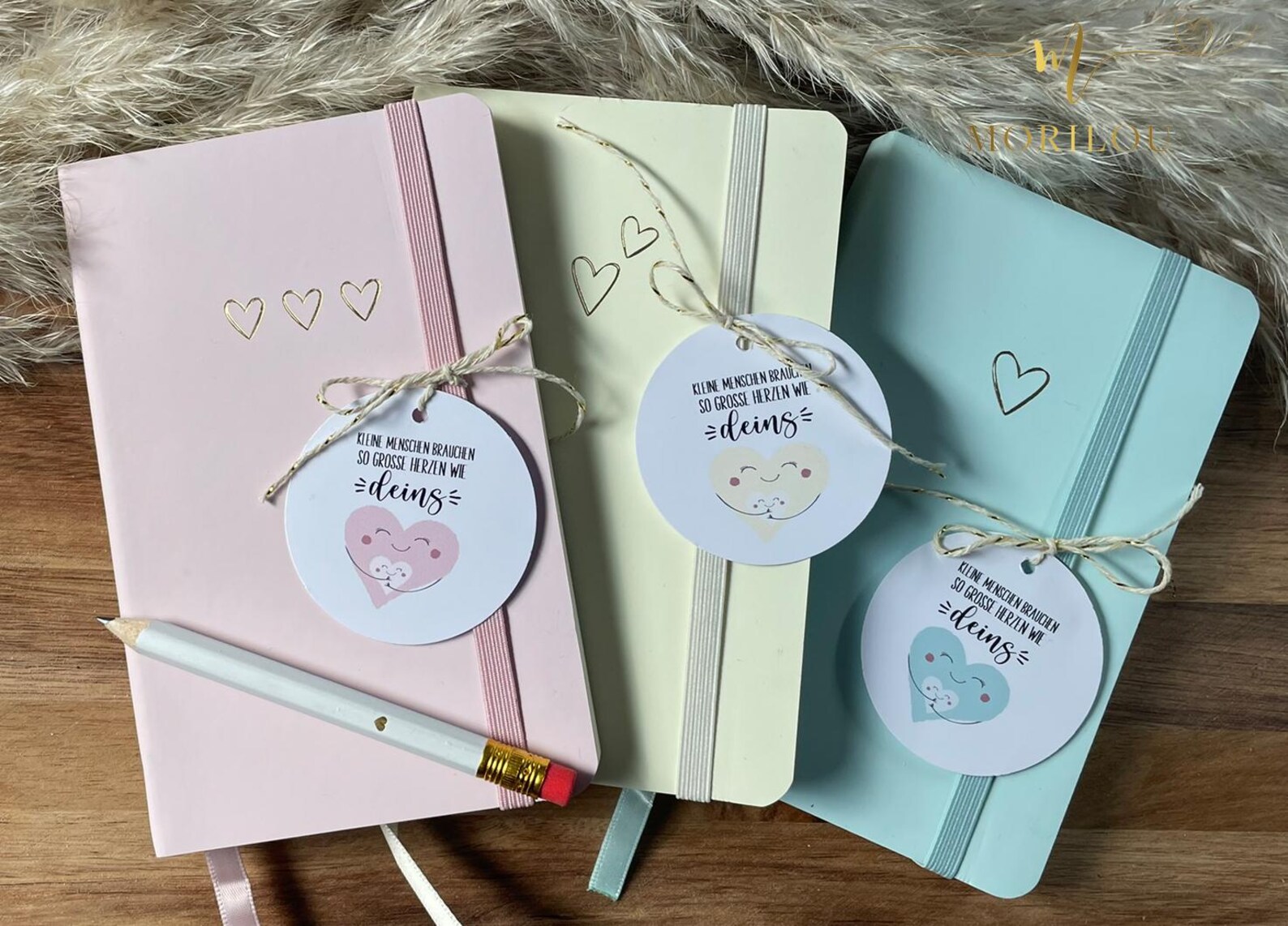 Die Notizbücher sind in wunderschönen Pastellfarben erhältlich: zartes Rosa, frisches Mintgrün und strahlendes Gelb – ideal, um kreative Gedanken, wichtige Notizen oder kleine Erinnerungen festzuhalten Jedes Notizbuch wird von einem charmanten Anhänger begleitet, auf dem steht: „Kleine Menschen brauchen so große Herzen wie deins.“