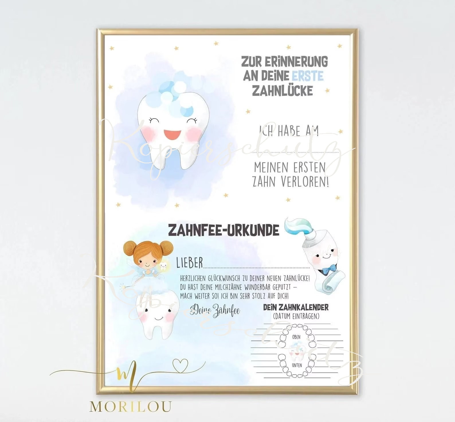 PDF Datei – POSTER Zahnfee Urkunde blau & Erinnerung an die Zahnlücke | Brief Zahnfee | Milchzähne | erste Zahnlücke Zertifikat | Urkunde