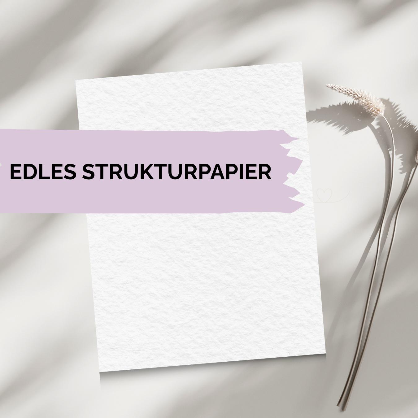 Gedruckt wird auf hochwertigem Strukturpapier, leicht cremefarben, Rückseite komplett leer für deine Worte.