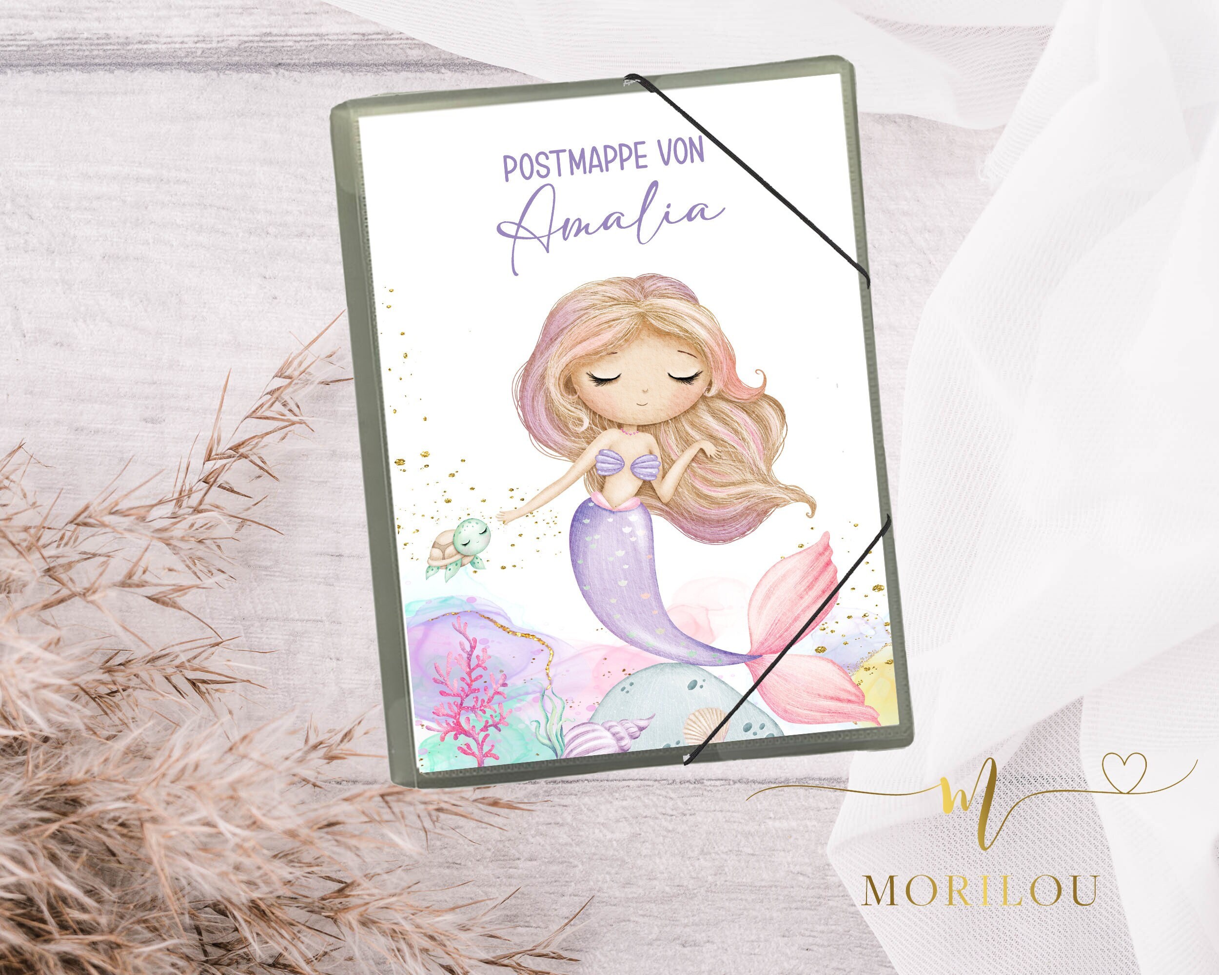 POSTMAPPE / SAMMELMAPPE für Kinder – personalisiert – Zeugnismappe, Kunstmappe, Sammelmappe mit vielen Kindermotiven A4 mit Meerjungfrau
