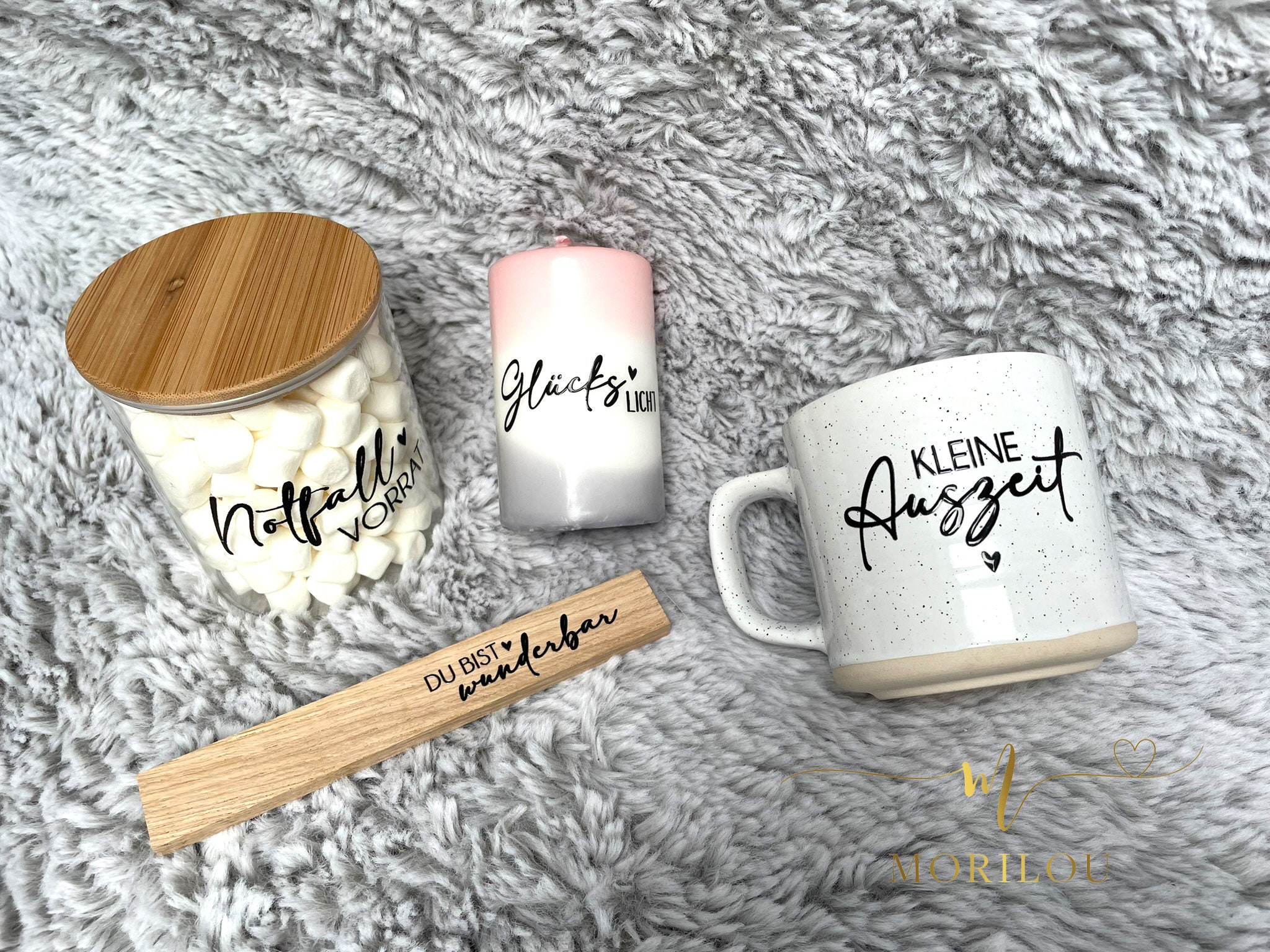 Ob Tassen, Untersetzer, Vasen, Laternen, Holzsticks – die Sticker zaubern aus jedem Gegenstand ein tolles Geschenk oder einen Hingucker für dein Zuhause. Die Sticker sind transparent, randlos, glänzend und leicht erhaben. Sie werden grob ausgeschnitten geliefert und müssen von dir nur noch abgezogen und aufgeklebt werden. Ruckzuck ist dein DIY Projekt fertig! Damit du lang etwas von deinem Herzensprojekt hast, empfehlen wir dir nur Handwäsche der Oberflächen und keine Spülmaschine/Hitze. Für die genaue Anwendung der Sticker schaust du dir gerne unser Video und unsere Anleitung, die der Bestellung beiliegt, an.