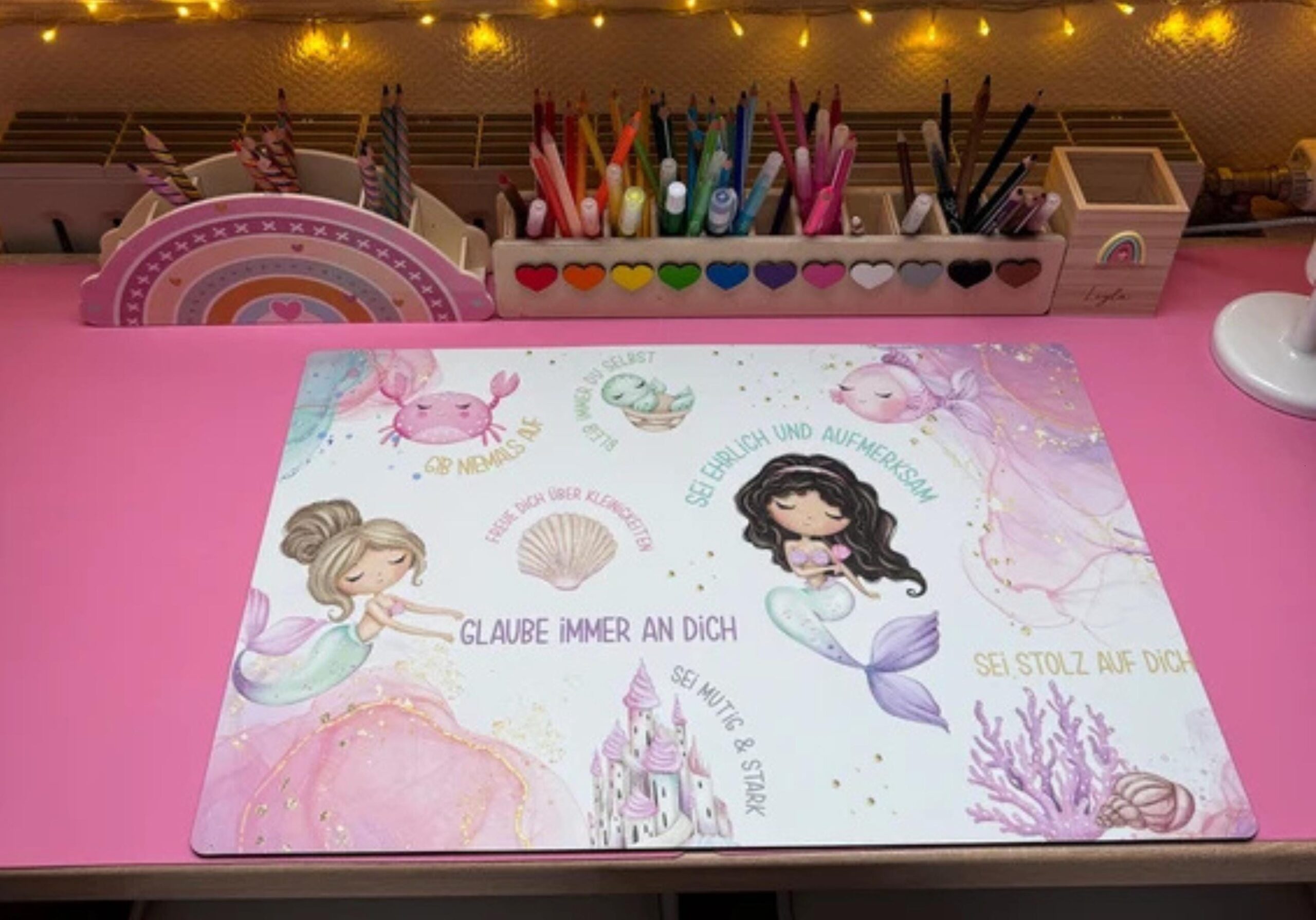 Die zuckersüße personalisierte Schreibtischunterlage (bzw. das Tischset) mit Affirmationen für Kinder ist das perfekte Accessoire, um den Tisch Deines Kindes aufzupeppen und gleichzeitig bietet sie eine praktische Arbeitsfläche und ausreichend Platz für Schreibutensilien und andere wichtige Arbeitsmaterialien oder das Geschirr auf dem Esstisch. Ein echtes Mutmachergeschenk!
