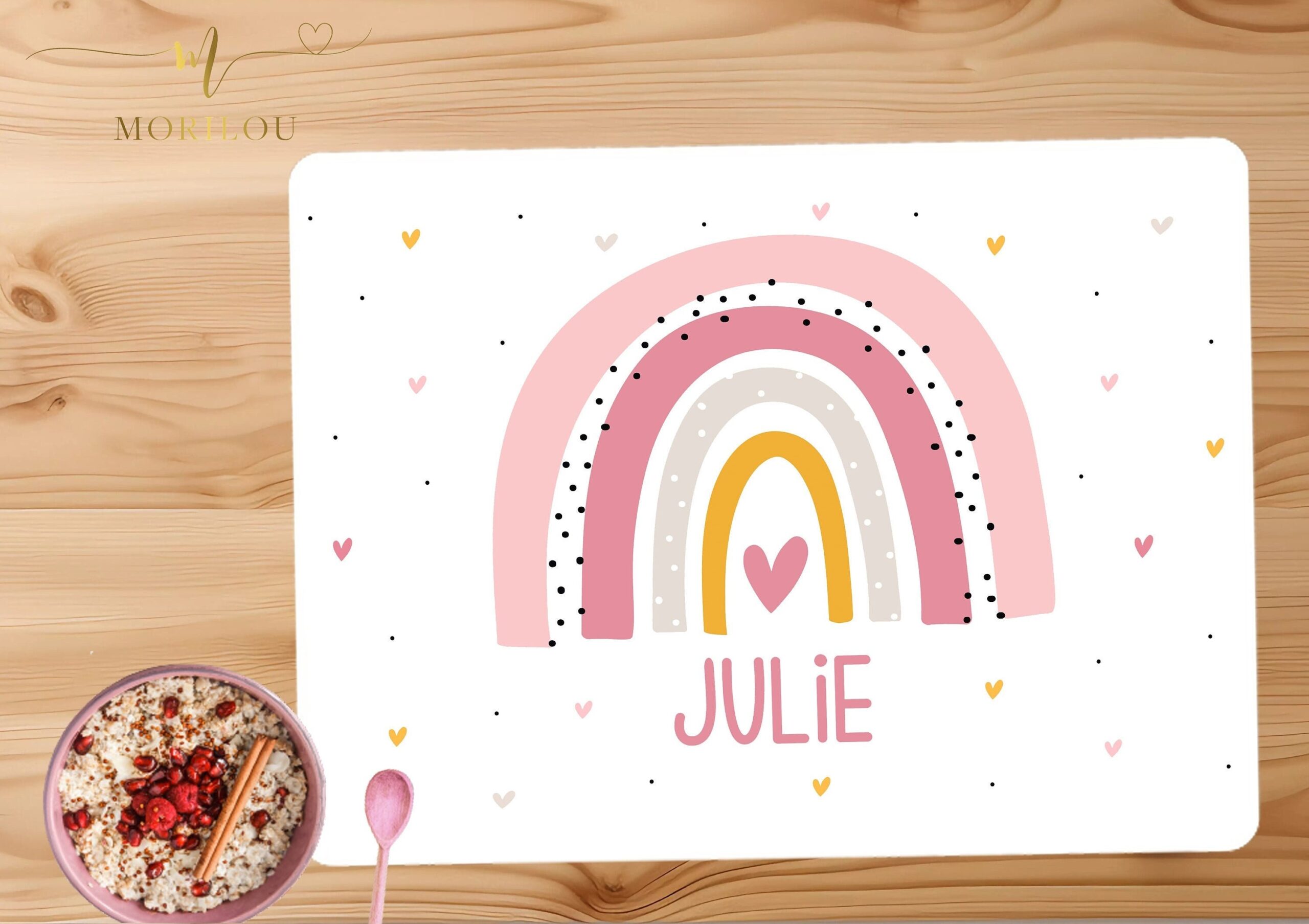 TISCHSET für Kinder mit Regenbogen personalisiert mit deinem Namen aus weißem, abwaschbaren Kunststoff / Platzdeckchen / Platzset für Kinder